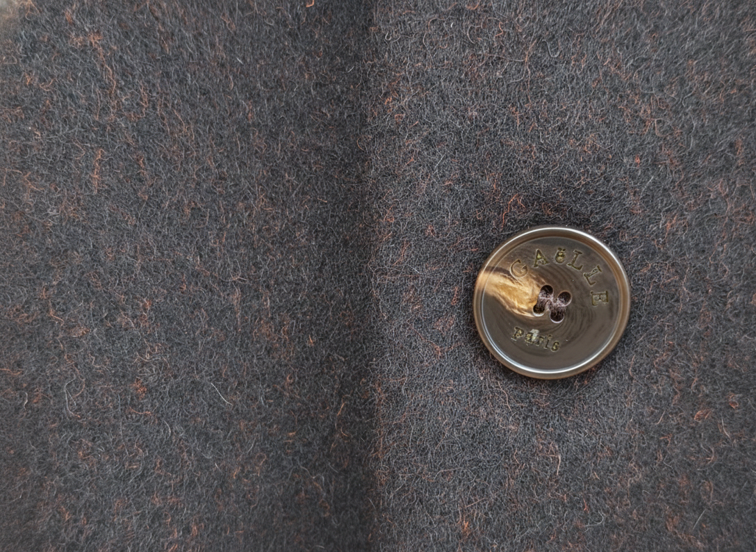 Firma del Brand: I dettagli fanno la differenza: bottoni personalizzati con logo "Gaëlle Paris" e la placchetta metallica distintiva applicata sul retro del collo.
