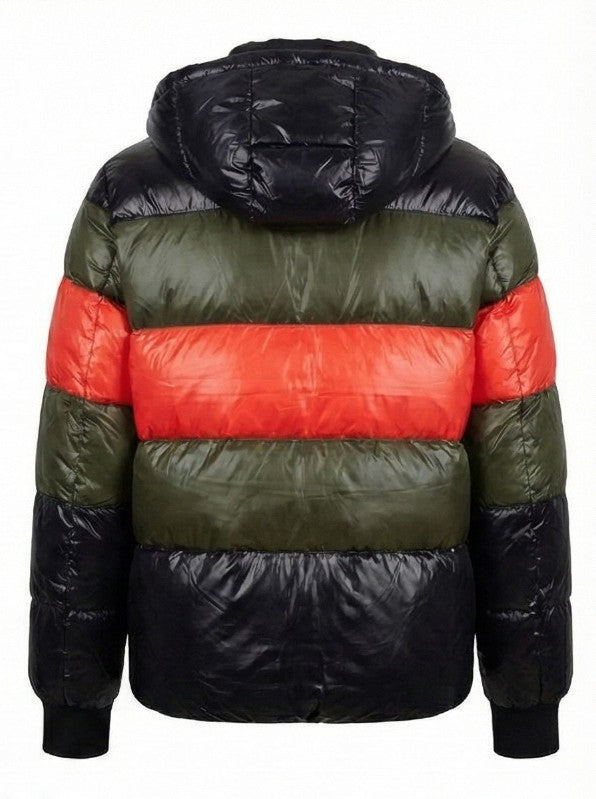 Piumino corto da uomo firmato Gaëlle Paris, realizzato in nylon lucido con iconiche bande orizzontali a contrasto verde militare, rosso e nero. Il capo presenta cappuccio integrato, chiusura zip centrale, tasche laterali con zip e logo applicato sul petto. Un must-have urban-glam, perfetto per affrontare con stile e comfort anche le giornate più fredde.